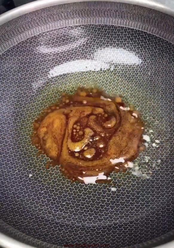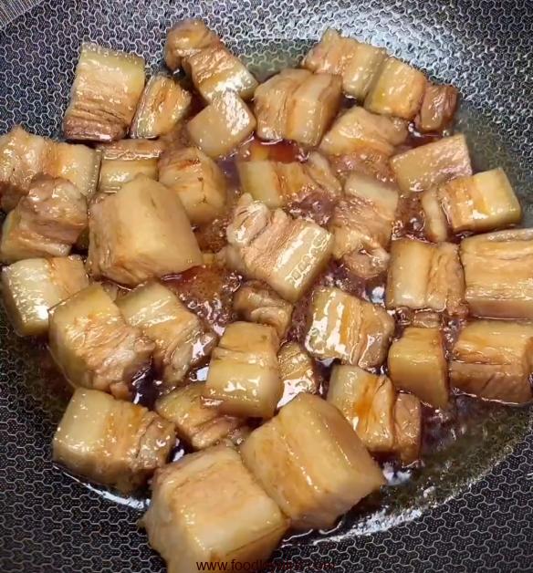 - Add appropriate amount of rock sugar to hot oil, and fry the rock sugar on low heat until it turns red. This is the key step to color the meat. Add the fried pork belly and stir-fry on medium heat for 5 minutes.