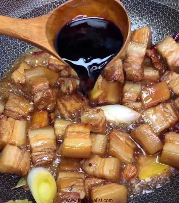 - Add scallions, ginger, star anise, cinnamon, bay leaves, dried chili peppers, and sauté until fragrant. Then deglaze with cooking wine (for removing gaminess), followed by light soy sauce, dark soy sauce, and oyster sauce for seasoning and color. Finally, pour in warm water to fully submerge the pork belly.