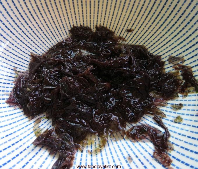 Place whole dried seaweed in a large bowl. Submerge in cold water for 3 minutes. This effectively removes dust from sun-drying. Use this time to prepare eggs.
