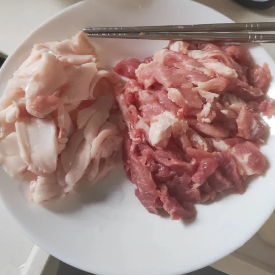 Cut the pork into thin slices against its texture (muscle fibers), and separate the fat and lean meat into separate bowls.
