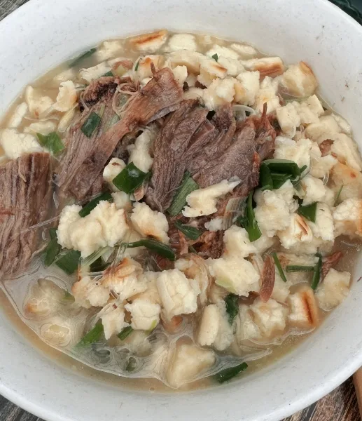 To be precise, Xi’an Meatball Hula Soup is a hearty stew of beef meatballs and vegetables. It includes ingredients such as beef meatballs, winter melon, carrots, zucchini, cowpeas, and napa cabbage, characterized by its distinctive numbing and spicy flavor. It is traditionally served with TUOTUO MO a type of dense flatbread. Locals often break the TUOTUO MO into small pieces at the bottom of the bowl and have the vendor ladle the hot and thick soup over it — creating a unique version of “Hula Soup Paomo.”